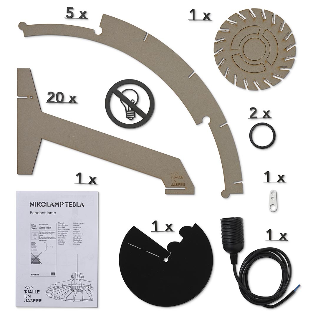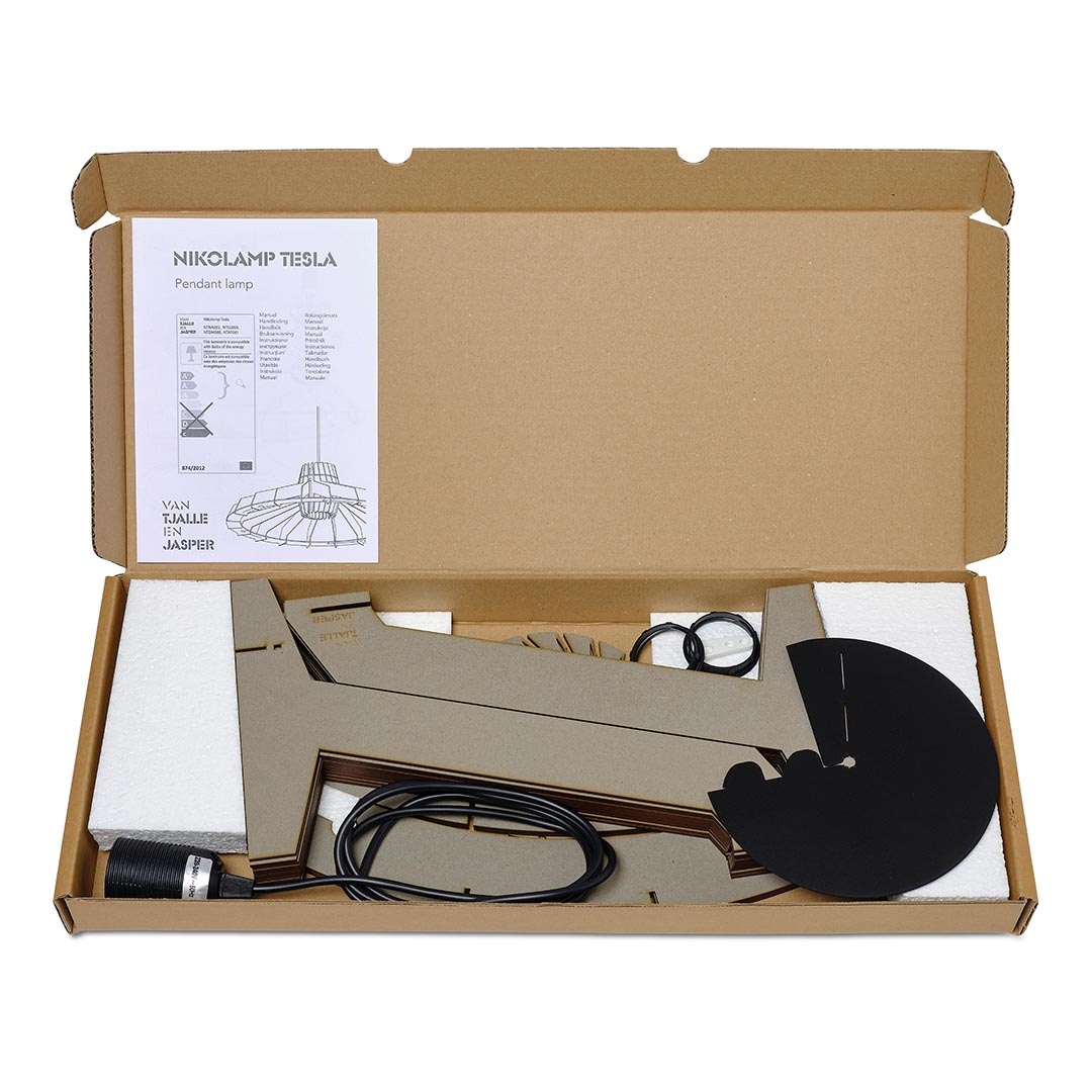 Nikolamp Tesla wordt geleverd als bouwpakket en zet je zelf in elkaar. Maar geen zorgen: alles wat je nodig hebt zit in de doos, inclusief een heldere handleiding. Daarmee kost het in elkaar zetten van deze lamp je hooguit een paar minuutjes!
