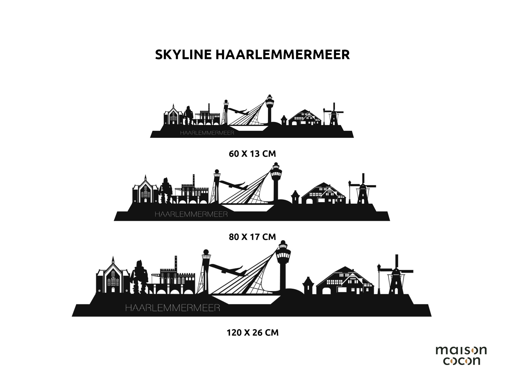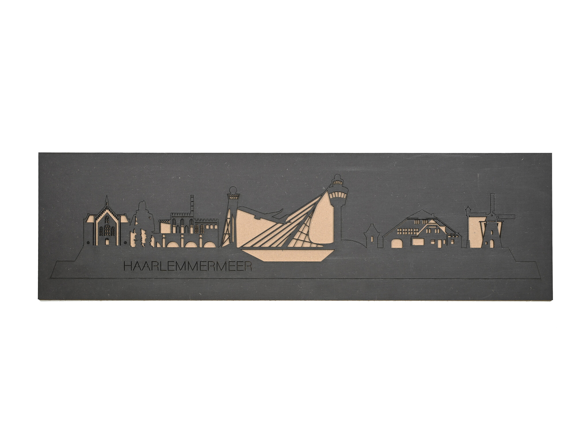Onze wanddecoraties zijn uitgesneden uit 3 mm MDF platen. De in huis gemaakte ontwerpen worden door onze lasermachines met hoge precisie uitgesneden. De wanddecoratie skyline Haarlemmermeer is te krijgen in verschillende afmetingen, hierdoor is er altijd een passende wanddecoratie voor jou.